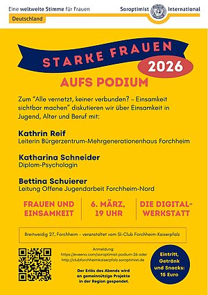 Bereits zum vierten Mal lädt der Club Forchheim-Kaiserpfalz von Soroptimist International zu einer Veranstaltung ein, die Frauen in den Vordergrund rücken will: „Starke Frauen aufs Podium“ hat zum diesjährigen Weltfrauentag am Freitag, 6. März, um 19 Uhr (Einlass ab 18.30 Uhr) das Thema „Alle vernetzt, keiner verbunden? – Einsamkeit sichtbar machen”.